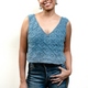 Designed with a deep V-neck front and back and lace-like floral-geometric granny square motifs, this lightweight and breathable piece is made from recycled denim yarns giving it a soft, skin-friendly finish.